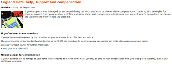 Another recent example is the England riots. The Government website, although [in my opinion] a user's nightmare, does clearly set out what someone should do if they have been affected. Whilst not optimum, it does serve a purpose, and it does guide the user somewhat. Their new AlphaGov BETA website is working on improving the usability side of things, through 'revolution' and not 'evolution'. Here is a fantastic article on AlphaGov by usability whiz, Leisa Reichelt.