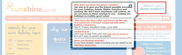 If you do NOT have a phone number, for whatever reason, then consider using it to your advantage. Look at how Sunshine.co.uk (above) have turned it into a plus point. They simply state that they're saving you money as a customer. So all the overheads and staff salaries saved quickly become a comforting sign and a benefit to the visitor.
